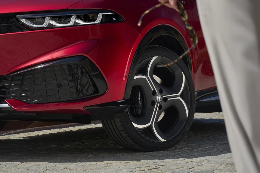 Der Tonale übernimmt die ikonischen Stilcodes von Alfa Romeo mit einer Frontpartie, die vom berühmten «Scudetto» und einer markanten Lichtsignatur geprägt ist. Seine dynamischen Proportionen und die sportlichen Felgen unterstreichen seinen Charakter als kompakter Premium-SUV.